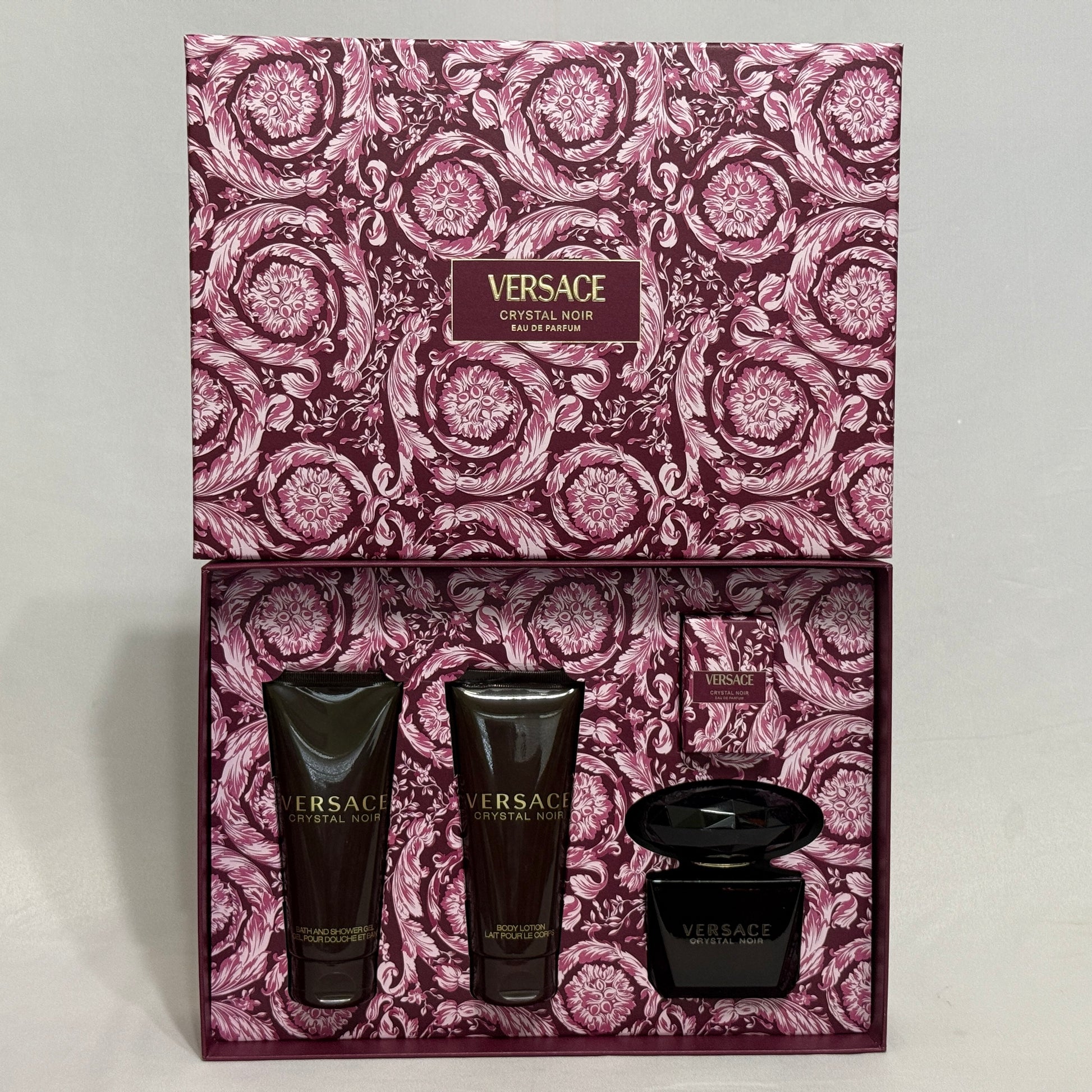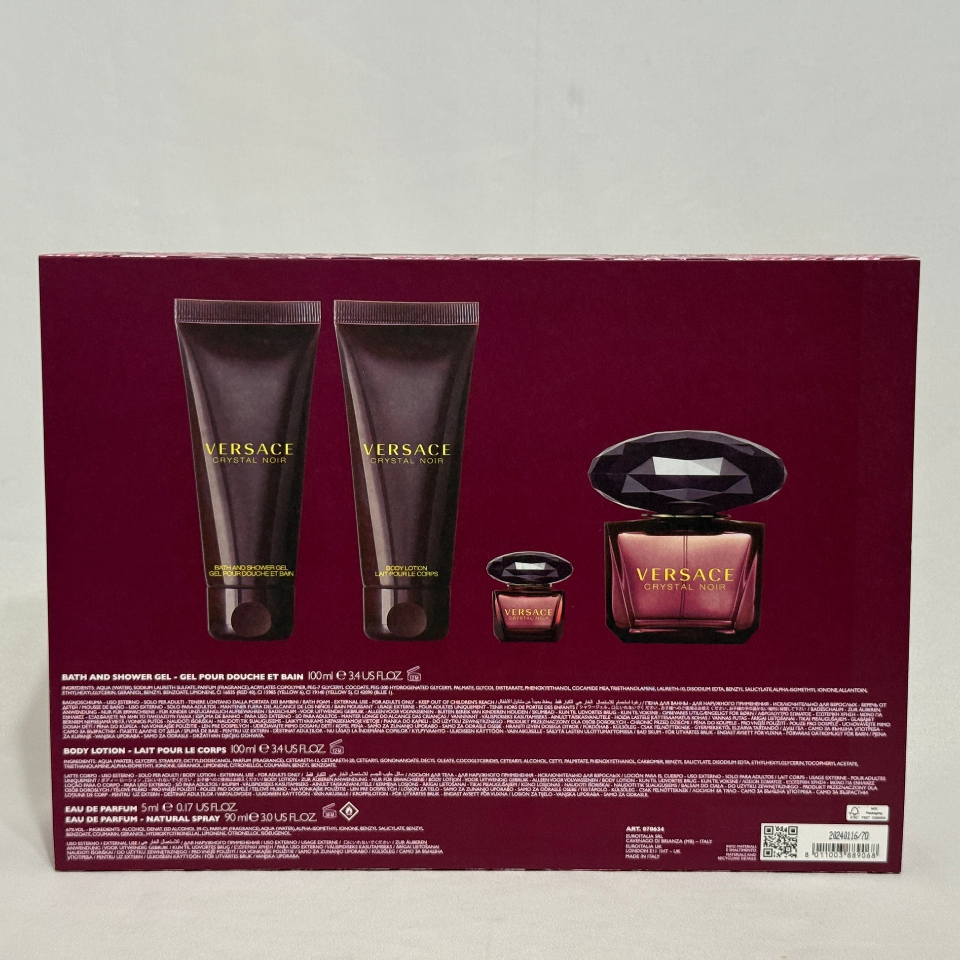 Versace Crystal Noir is a sophisticated fragrance that opens with luminous citrus and floral heart notes, making it ideal for daytime wear and warmer seasons. This luxurious 4-piece gift set includes a full 3 oz eau de parfum spray for everyday elegance, a convenient 0.17 oz travel spray for on-the-go freshness, plus a 3.4 oz body lotion and 3.4 oz bath & shower gel to extend the fragrance experience. Perfect for spring and summer occasions, from casual outings to evening events, this complete collection lets you layer the scent while nourishing your skin with complementary products.
